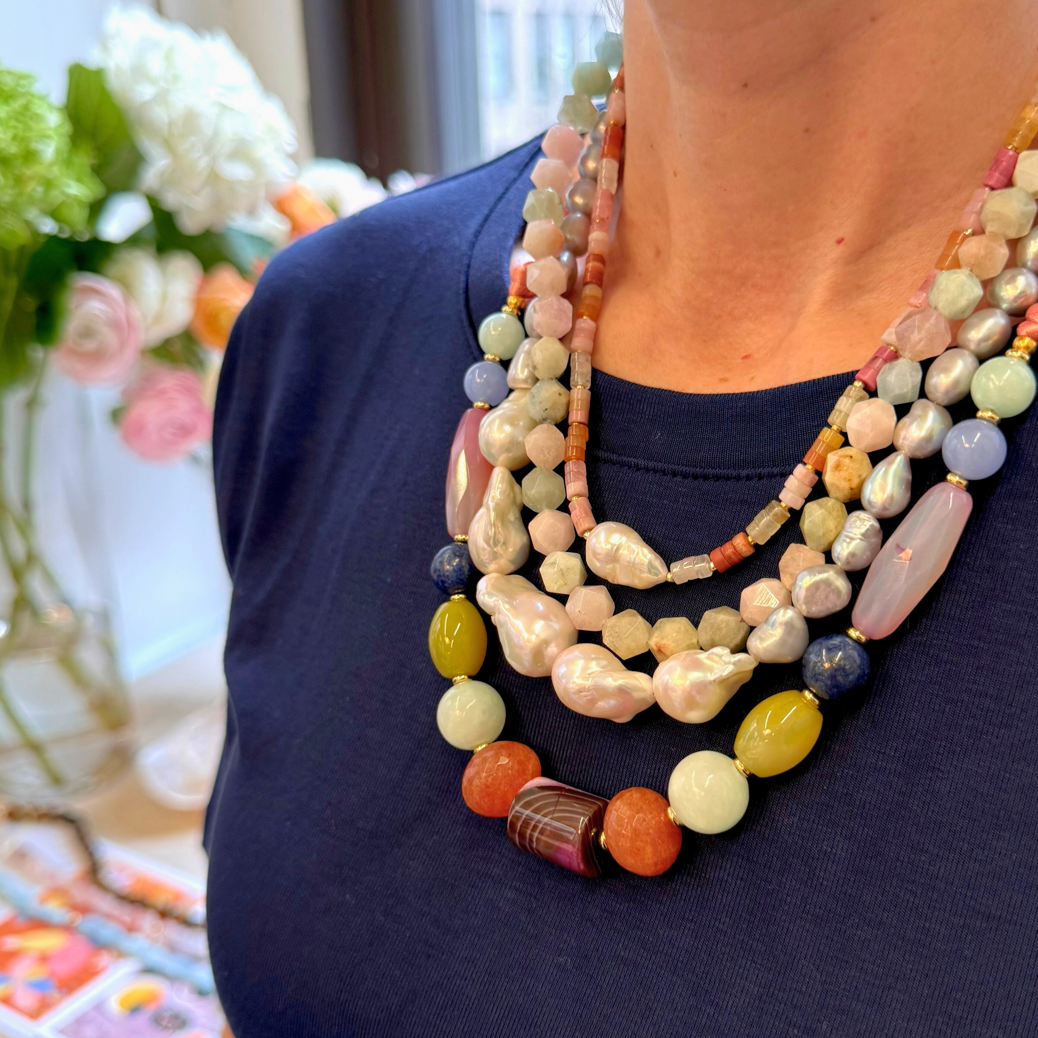 - Materials: 22K gold-dipped bronze, multi semi precious heishi beads and fresh water pearls. Please note that each stone is naturally formed so no two are alike - because of this natural variance, the stone (s) in the jewelry you receive will not exactly match the product pictured here.