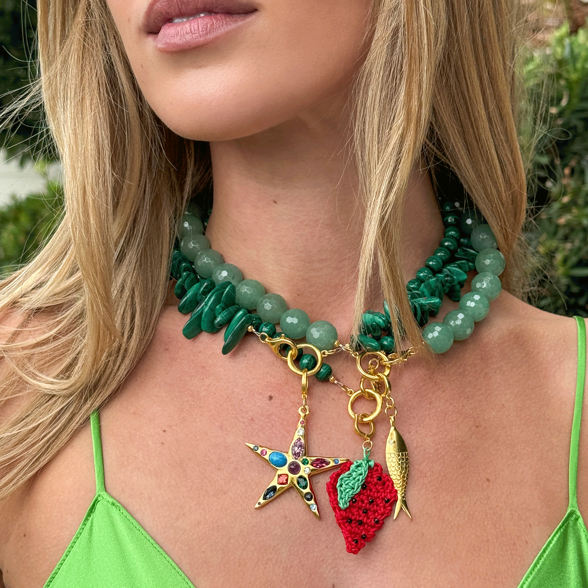 The Aventurine Gumball Necklace is not only pretty to look at, it boasts special meaning. As the stone of opportunity, it puts you in a forward flow and ushers in a mindset of abundance. This strand is strung with faceted genuine semi-precious stones and finished with a gold clasp that can be adorned with a clip-on charm.