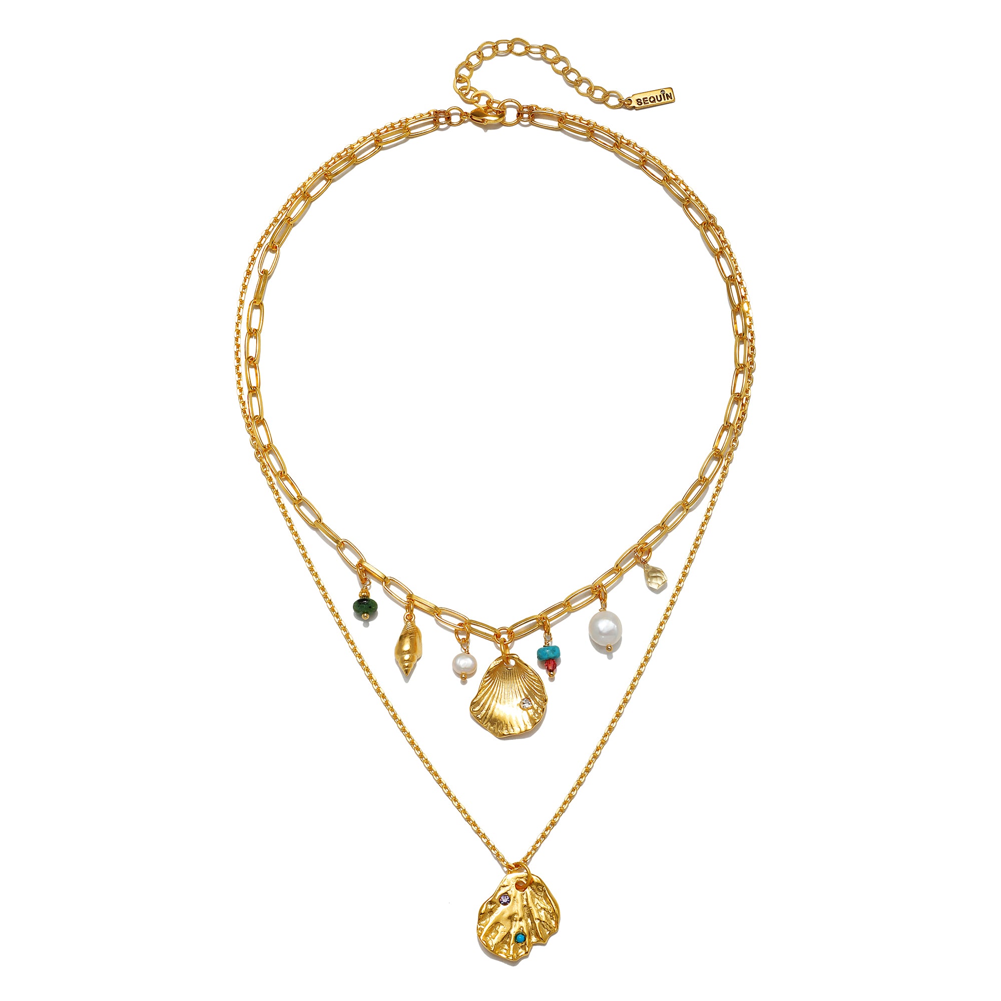 The Sirena Necklace is the perfect piece to pack for your coastal adventures. Featuring a curated attached set, it takes the guesswork out of layering. A shorter paperclip chain adorned with charms and gemstones is paired with a long shell pendant to create visual balance—wear this as is or add a strand of beaded gemstones to complete the bohemian mood.