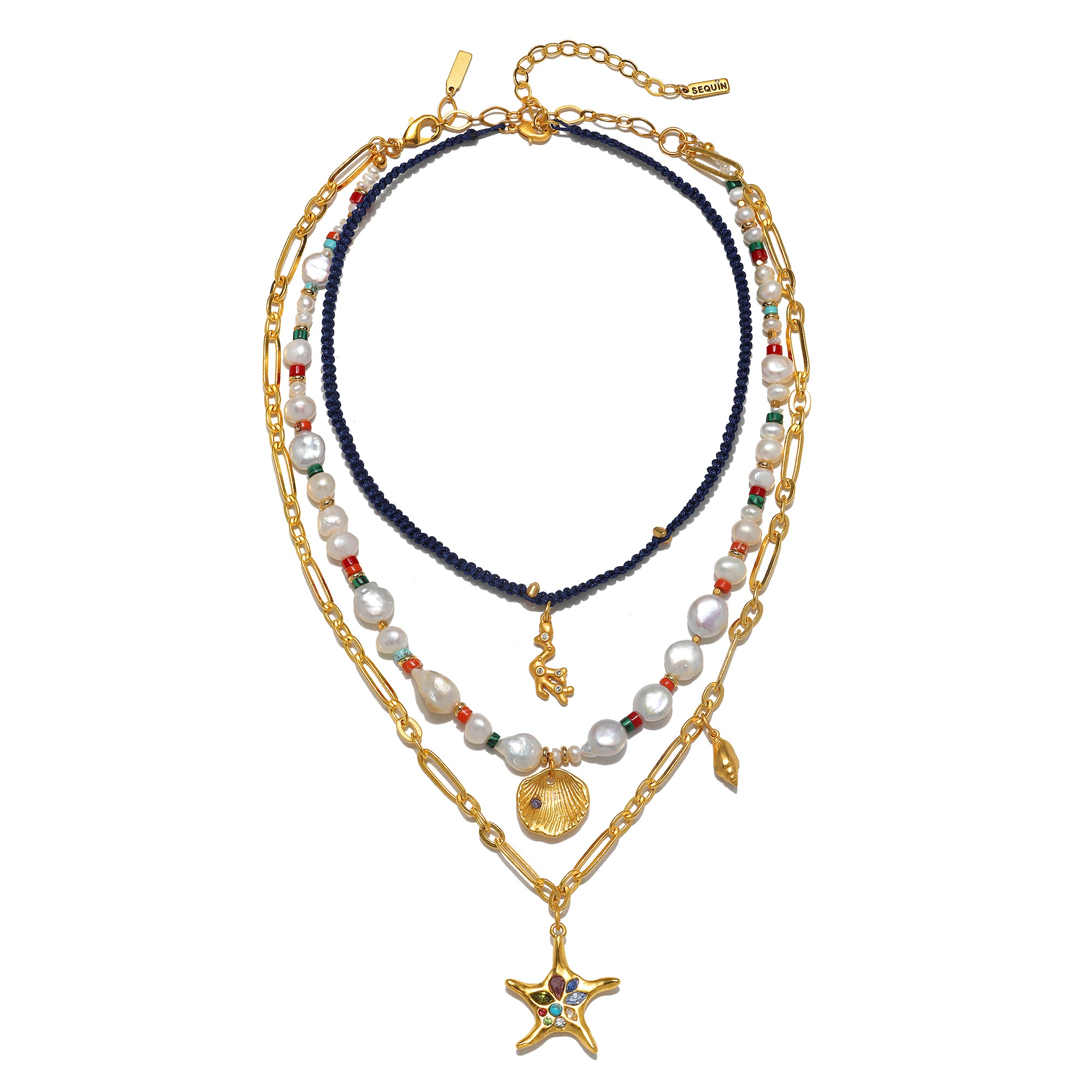 The Formentera Necklace is the ultimate vacation piece. We pair mixed materials like cord, freshwater pearls, gemstones and chain together for playful texture, and the centerpiece is a sculpted starfish talisman that highlights our signature mosaic technique. The best part? Designed to be convertible, this triple-layered necklace can be detached so that the corded choker can also be worn separately.