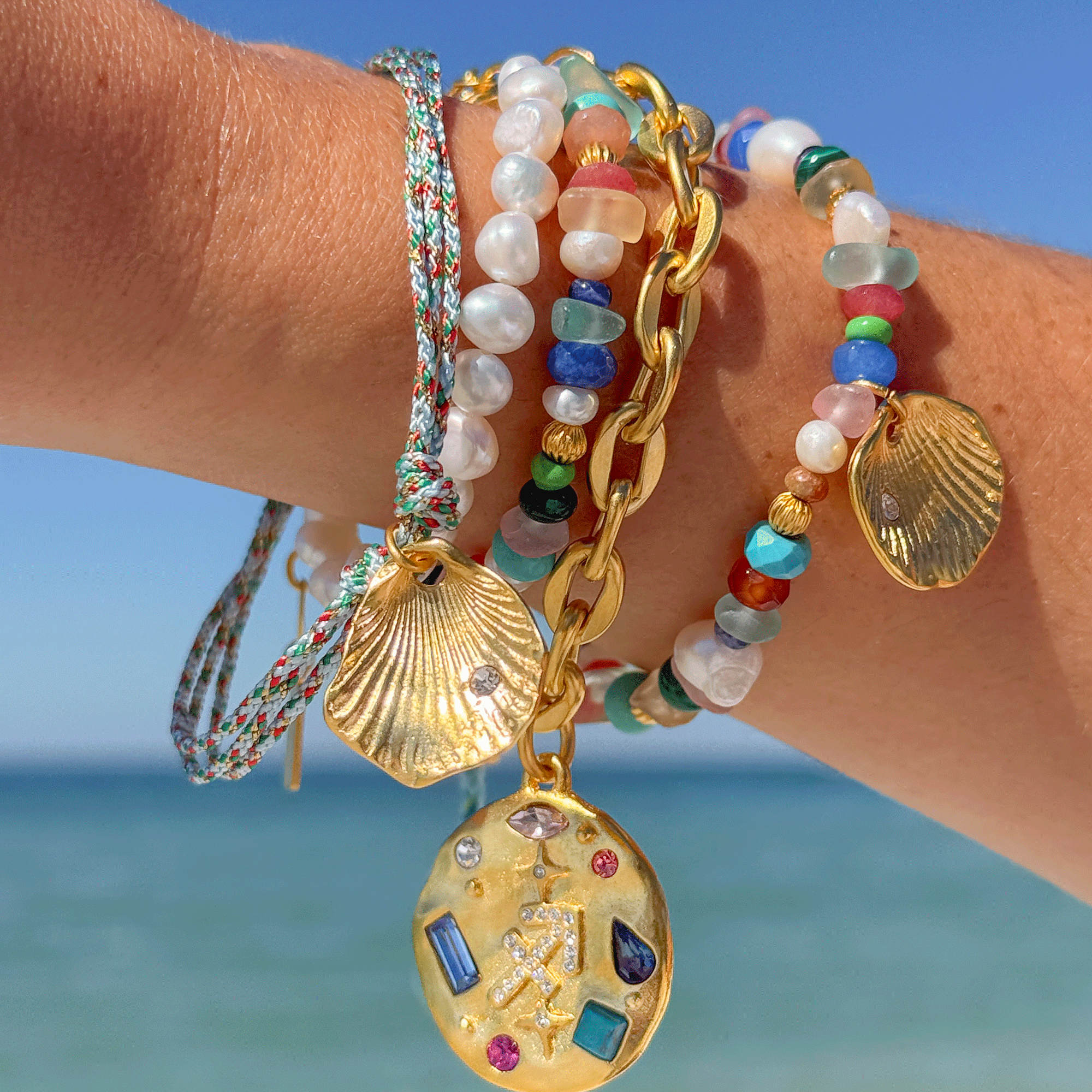 • Materials: 22K gold-dipped brass, nylon cord, multi semi precious beads and fresh water pearls.