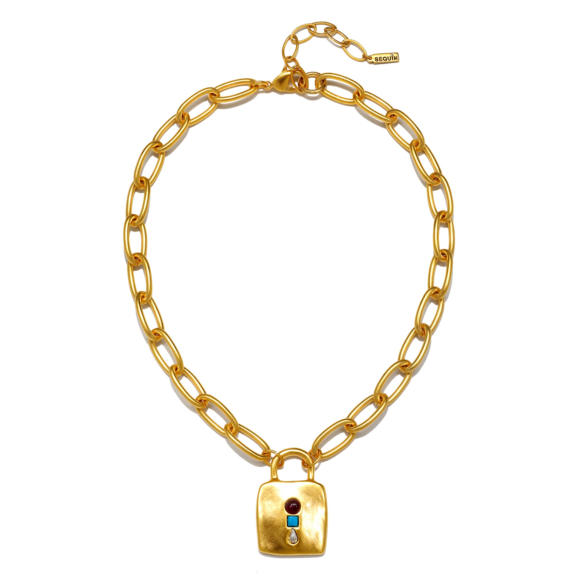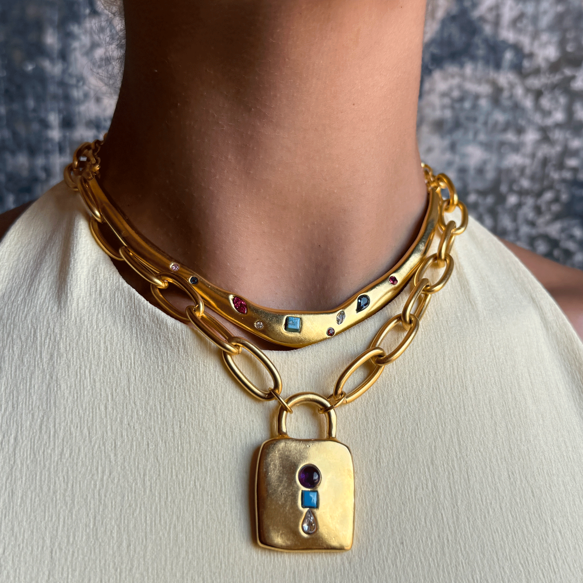 The Jordan Necklace is a symbol of strength and protection. We love that locks hold varied meaning, from utilitarian to unbreakable connections. Our version is hand-sculpted for a softer silhouette and finished with malachite and amethyst for a hint of color. Wear this bold statement as personal armour or to add an elegant edge to your look.